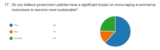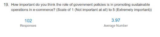 A positive and significant correlation was noted between the belief in the significant impact of government policies on encouraging e-commerce businesses to become more sustainable and the perceived importance of government policies in promoting sustainable operations in e-commerce.